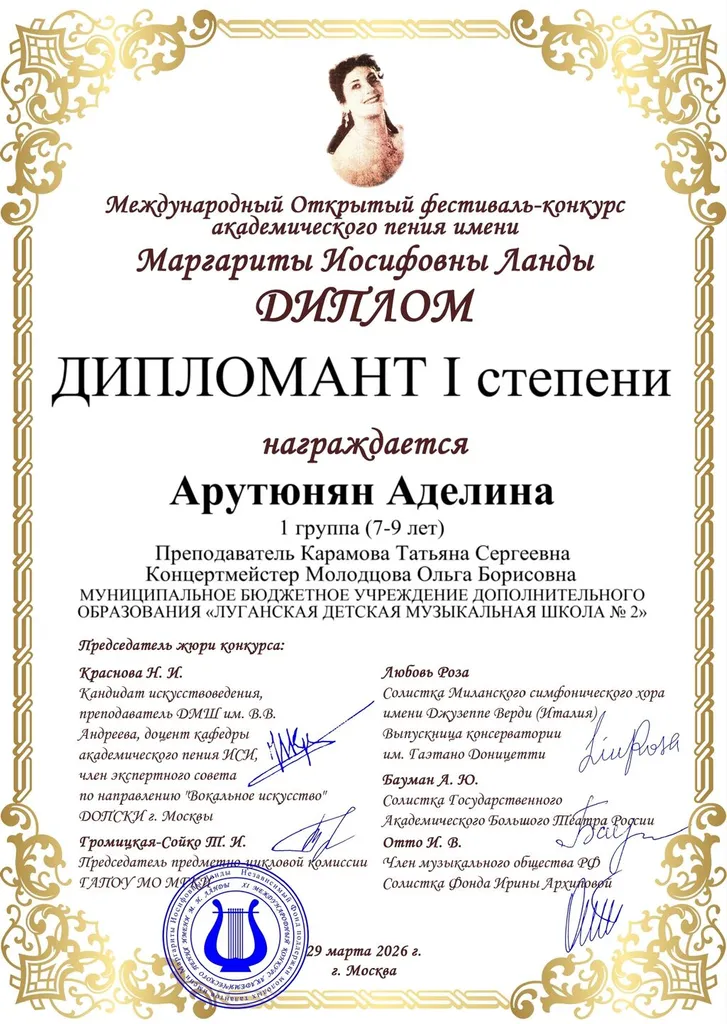 Арутюнян Аделина - дипломант 1 степени Международного открытого фестиваля-конкурса имени М. И. Ланды (Москва)!
